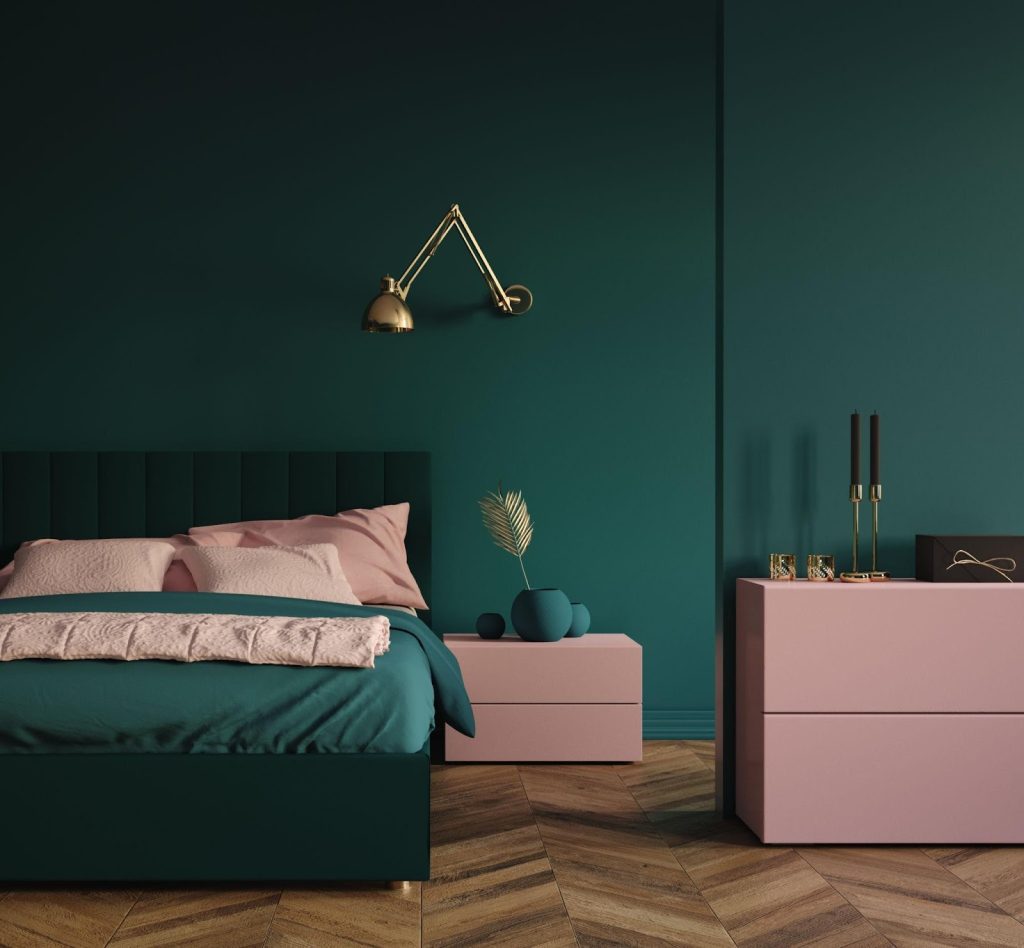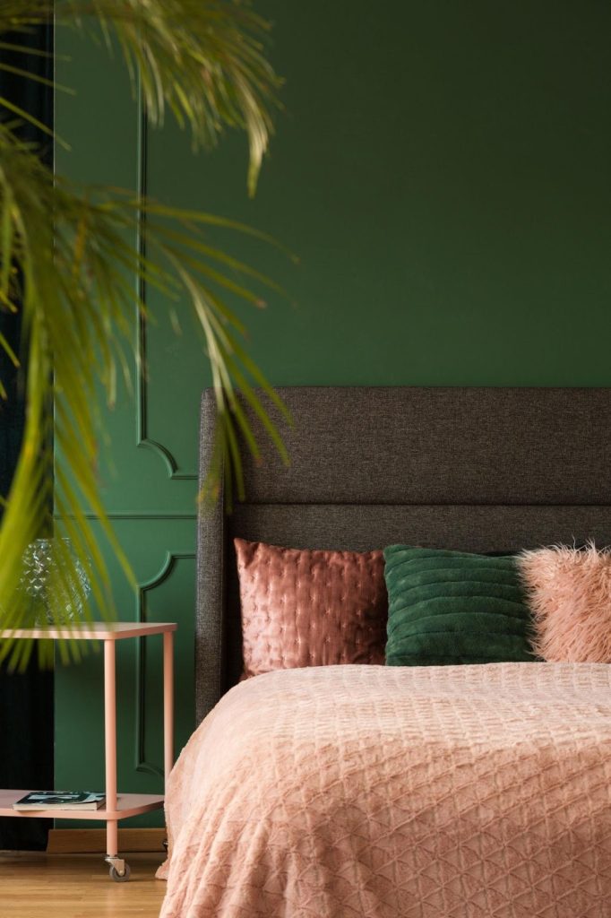 Forest green adds depth and drama, while pale pink softens the mood. This pairing works beautifully in larger bedrooms with good lighting.