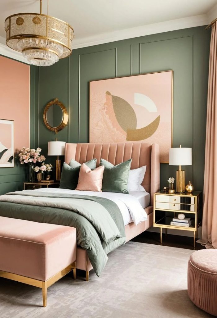 For a bold and luxurious vibe, paint one wall emerald green and pair it with dusty rose accents. Velvet pink cushions or a tufted headboard instantly elevate the space.
