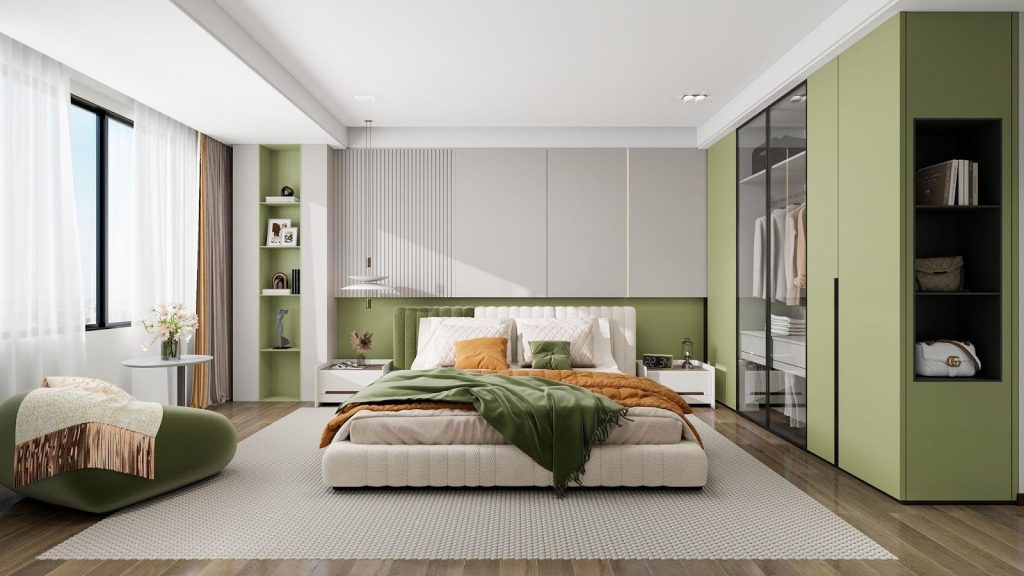 This is a cozy take on a modern bedroom green desgin that feels grounded and inviting.