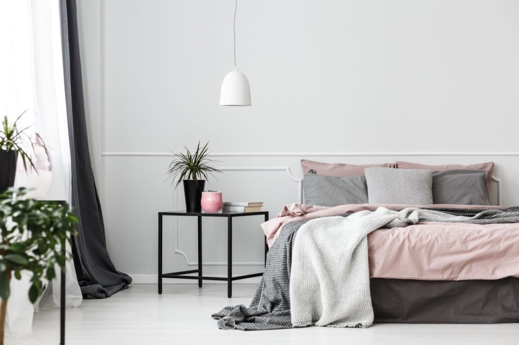 Blush pink adds warmth and softness to grey walls. This combination feels elegant, romantic, and welcoming.