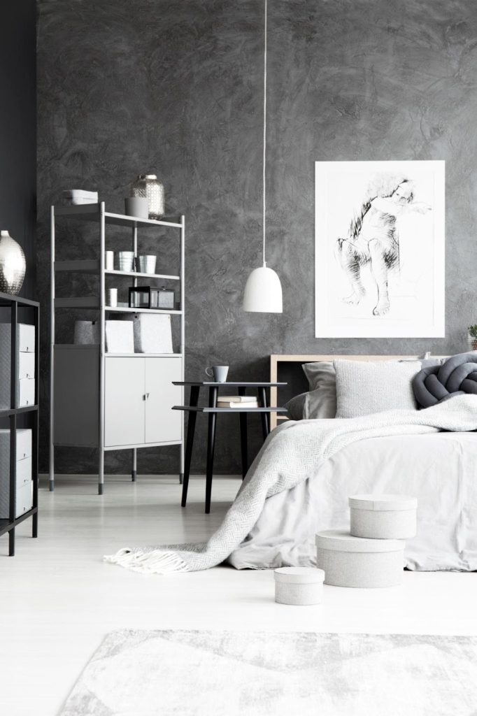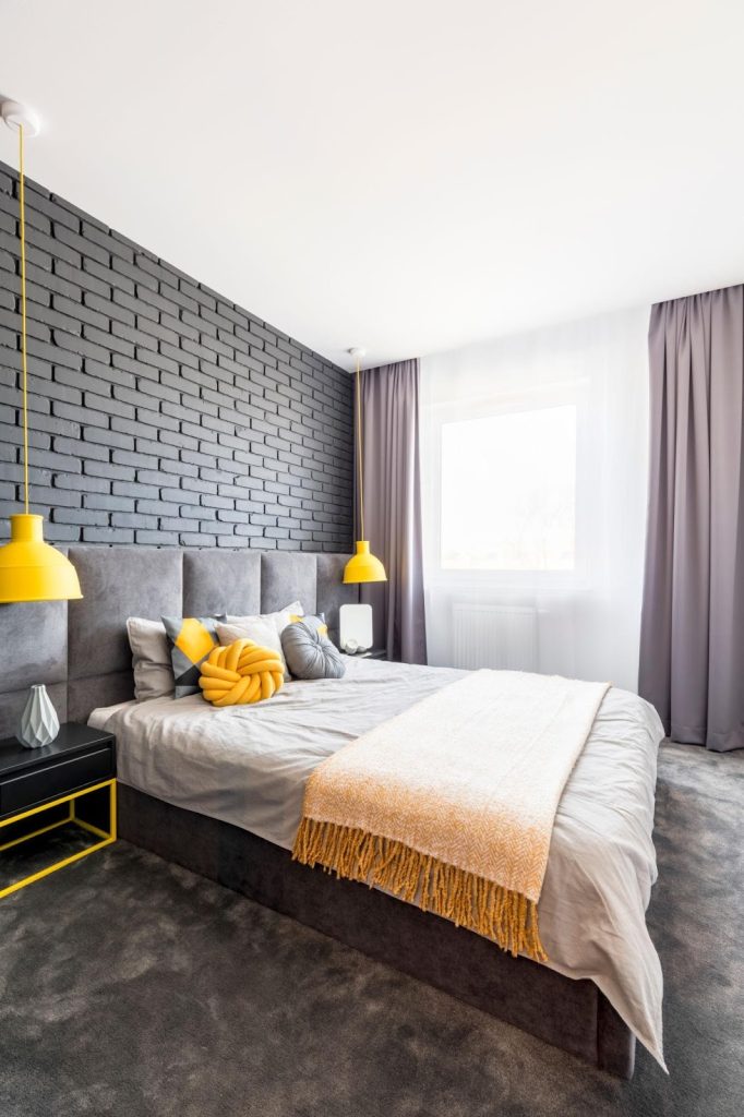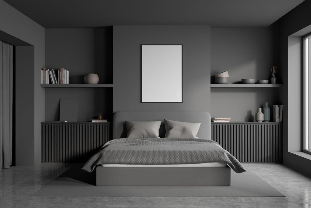 Grey walls are perfect for an industrial-inspired bedroom. Think concrete finishes, exposed textures, and black metal accents.