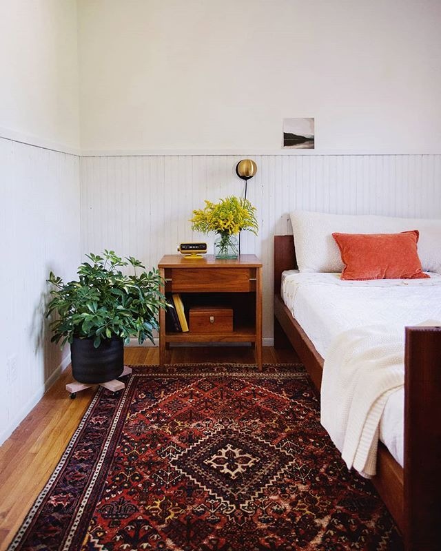 Layering a vintage rug under a modern bed frame ties the styles together seamlessly.