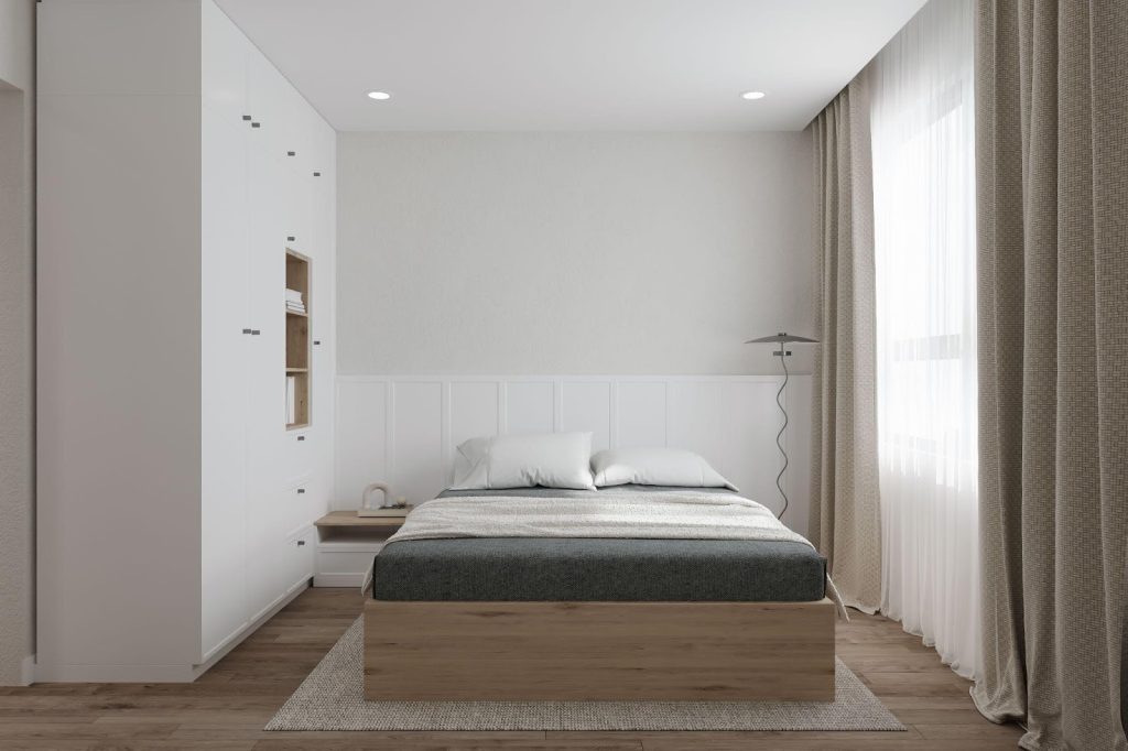 Choose warm whites instead of stark cool tones to avoid a clinical look. Layer with textured bedding and light wood furniture for warmth.