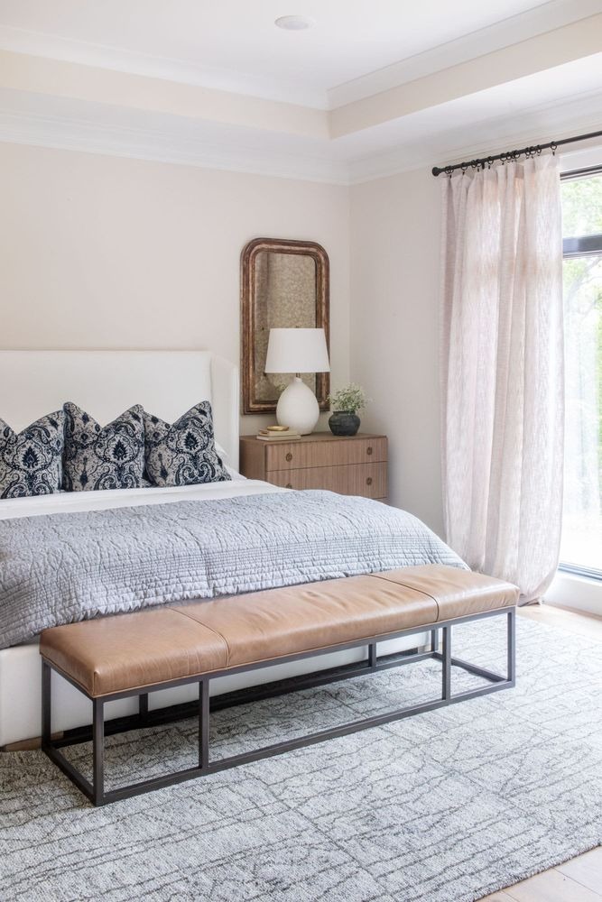 Layering materials creates depth and prevents your bedroom from feeling flat or overly coordinated.