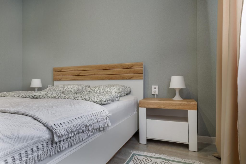 Wood pairs beautifully with neutral bedding and soft textures.